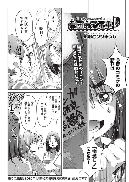 痴●が乗り合わせる電車の中で、女の子達が取り囲まれ、衣服の隙間より肉体をまさぐられる…集団痴●電車シリーズの完結編!!最後のターゲットは同人活動に勤しむマン研女子達。新刊のテーマを電車痴●に絞りとした女子達はいざ資料集めとばかりに乗車。男達が密集する車内に制服女子が乗り込めば、必然と伸ばされてくるいくつもの手。その短いスカートをめくり、シャツをもたくし上げ、白い下着の中にまで無遠慮に侵入してくる欲望の這いずり。この体験を乗り越えて女の子達の新刊は無事完成となるのか──!?